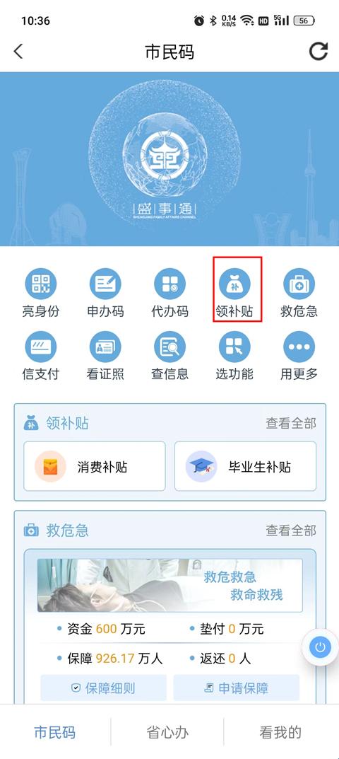 2、市民码页面,点击选择领取补贴。
