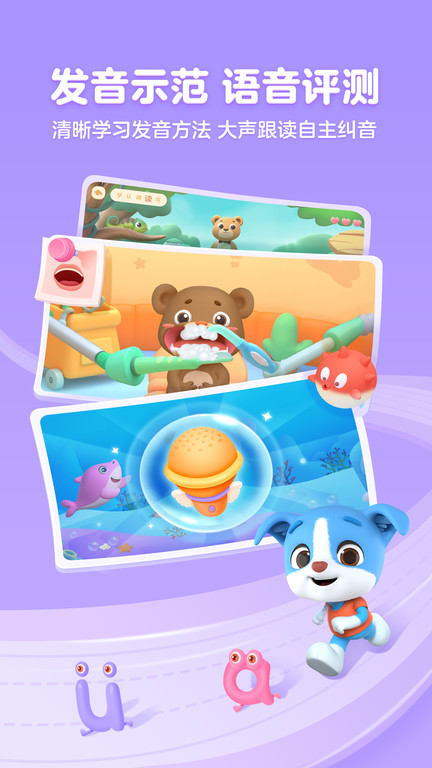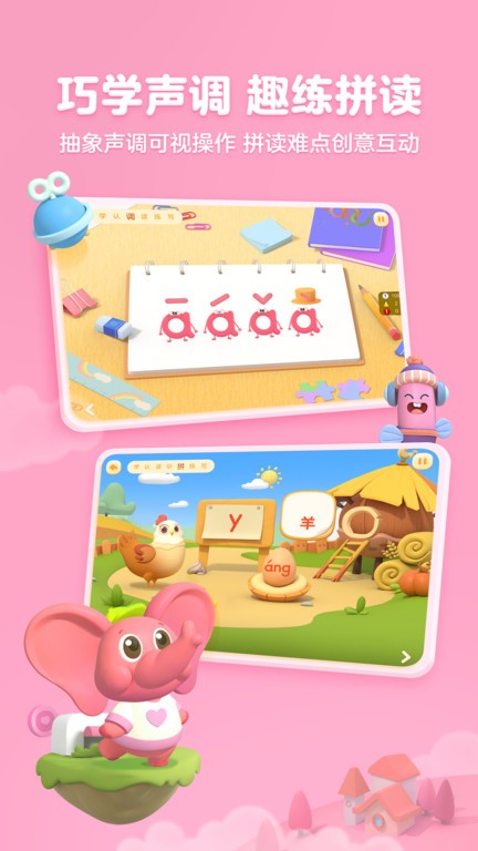 秉承科学原则,共分为预习、认形、声调、听音、跟读、练习、书写、测试等环节,让孩子学习拼音形状、发音、拼读、声调、书写等能力