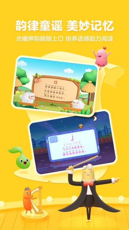 采用卡通角色动画形式来解说拼音字母,让孩子感知拼音形状,听取拼音发音,形成关联记忆