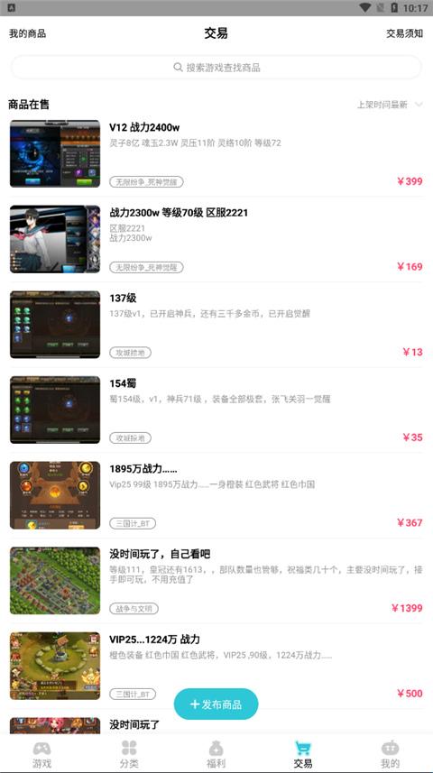 4、点击交易,可以查看其他玩家挂到平台上的各类高性价比账号;