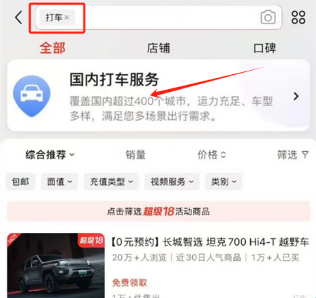 1、在烧荒软件园下载并安装京东app,打开后进入首页。在搜索框内输入“打车”,点击“国内打车服务”。