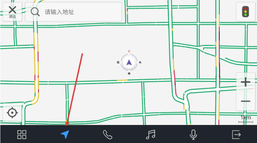 1、在主界面点击左下角蓝色方块图标应用抽屉,进入后点导航,在地图页可输入地址搜索,底部箭头可辅助定位。