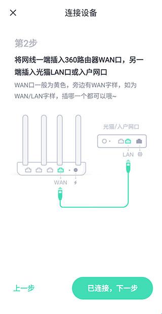 4、第2步将网线一端插入360路由器WAN口,另一端插入光猫LAN口或入户网口,WAN口一般为黄色,旁边有WAN字样,如为WAN/LAN字样,插哪一个都可以。