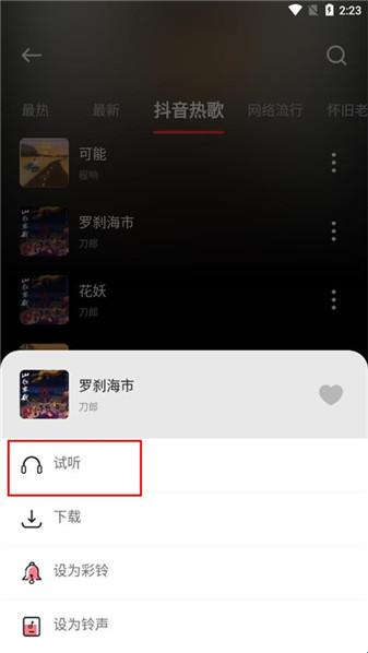 2、软件中有很多不同类型的歌曲可以选择试听,还可以点击下载、设置成铃声等等。