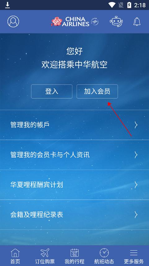 在打开的新页面中点击【加入会员】,注册时可以免费加入中华航空华夏会员的