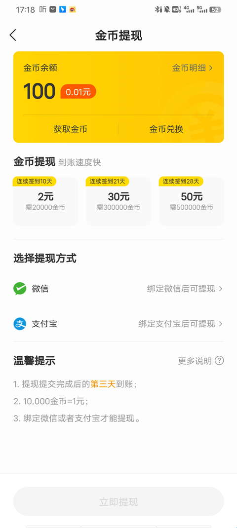 2、金币可以用户兑换现金,10000金币可以兑换1元,用户体现后三天内到账。