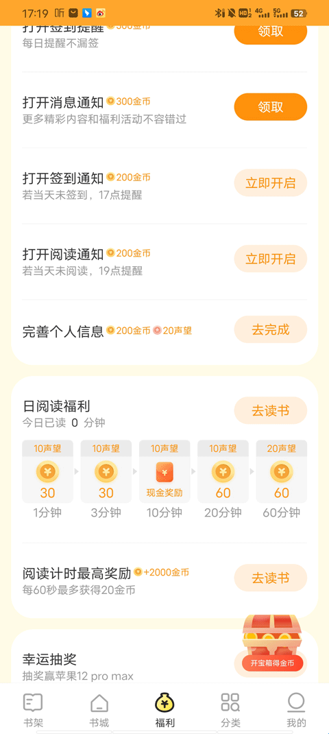3、获得金币的方式有很多,用户可以在福利页面往下滑,看到很多金币获得方式,如阅读、完善信息、打开消息通知等等。