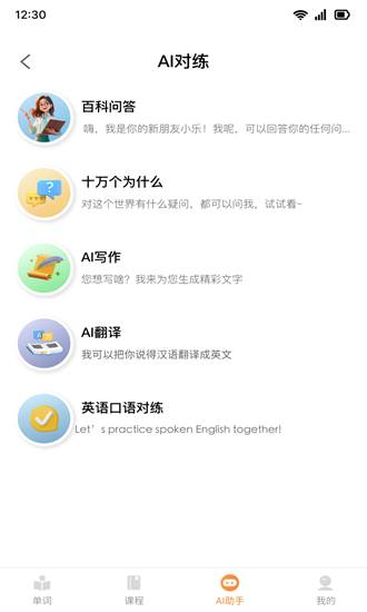 2、AI智能辅助功能:“AI对练”支持英语口语实时对话,用户可与AI助手“小乐”练习日常表达,提升口语应用能力;“AI翻译”可快速实现汉英互译,辅助理解单词在不同语境中的用法;“AI写作”能根据需求生成英文文本,帮助用户将所学单词应用于写作实践,同时“百科问答”功能可解答学习中的各类疑问,拓展知识边界。