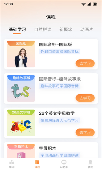 2、【课程】专区提供了“自然拼读”和“启蒙动画”资源