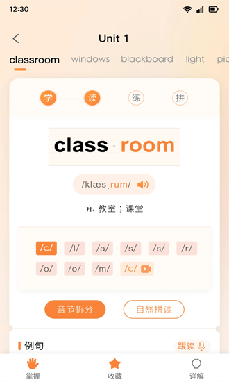 1、词汇学习与记忆功能:支持“学-读-练-拼”全流程学习,用户可跟随音频跟读单词、通过音节拆分练习拼写、结合例句掌握用法;“收藏”功能允许标记重点或疑难单词,方便针对性复习;同步课本单元词汇,用户可按教材进度规划学习,确保所学与课堂内容紧密衔接,提升学习效率。