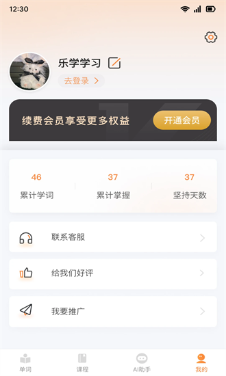 3、课程管理与个性化功能:“课程”板块分类展示音标、字母、自然拼读等学习内容,用户可按需选择学习模块;支持自定义学习计划,根据自身时间与目标设置每日学词量;“我的”板块整合学习数据、会员权益、反馈入口,方便用户管理学习进度与获取更多服务,续费会员还可解锁更多优质学习资源。