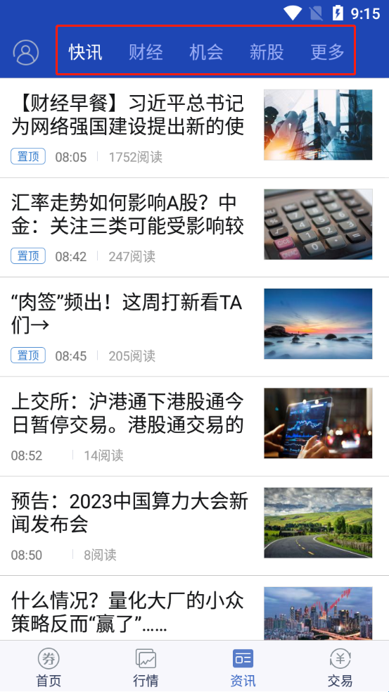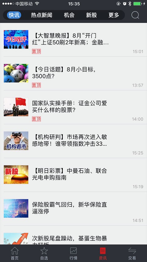 4、在“资讯”中,也是可以选择自己感兴趣的资讯进行观看,其中包括:快讯、财经、机会、新股以及更多等。