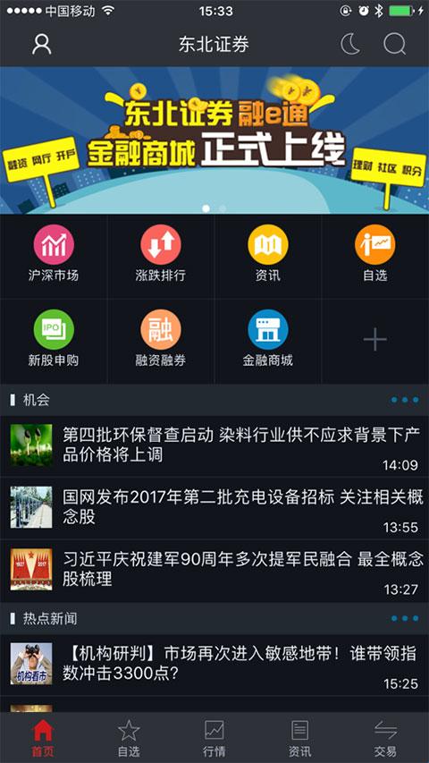 2、在“首页”中,可以看到涨跌排行、资讯、自选、新股申购、融资融券等。