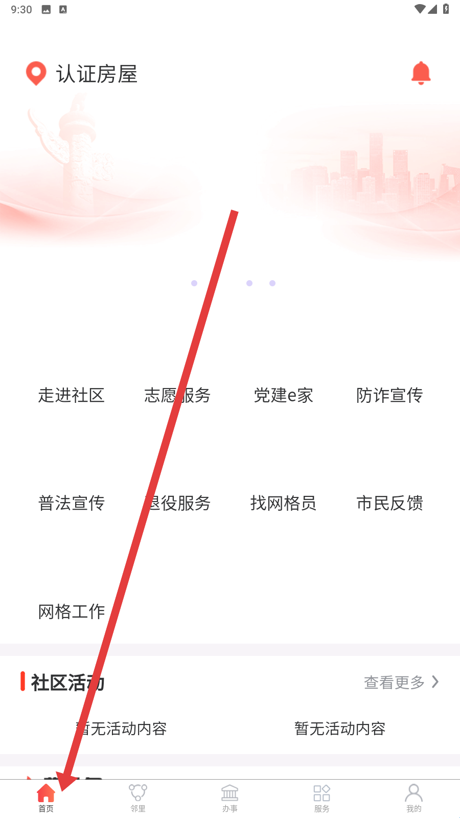 2、同意协议后进入首页同意协议后进入首页,底部有首页、邻里、办事、服服务、我的等功能栏,当前在首页可查看各类社区服务板块。
