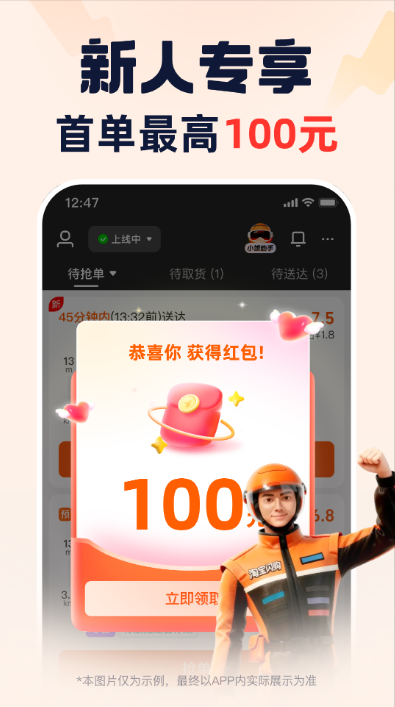 4、新手友好:专属优质单,单多顺路距离近;跑单红包,首单即有奖多跑多拿;