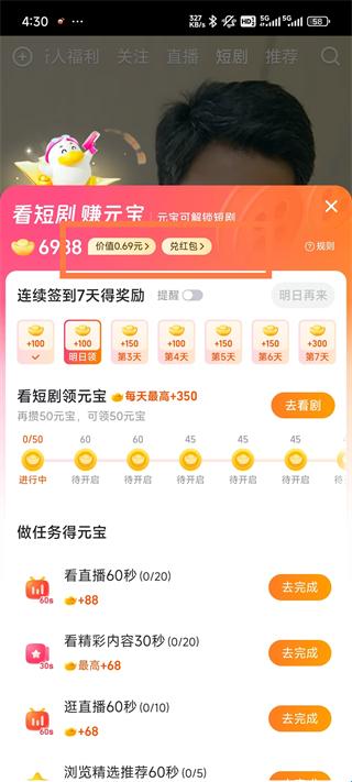 2、登入成功之后可以看到这里有直播短剧等等内容另外还能签到兑换红包。