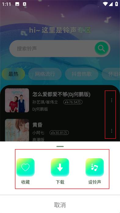 4、最后,点击音乐后面的三个点,就能弹出下载和保存的按钮,如下图所示,这样设置铃声就完成啦。