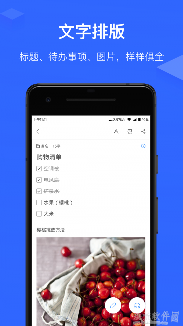 精心设计的编排工具条、智能标点、待办事项等等功能,可以方便而优雅的完成一篇图文并茂的笔记。