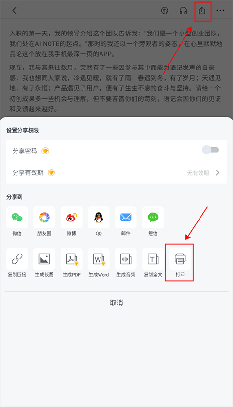 1、首先进到讯飞语记,我们点击文本进到文本界面,点击右下角的“箭头”分享图标,然后我们可以在最下面一行看到“打印”点击之后连接你的打印机。
