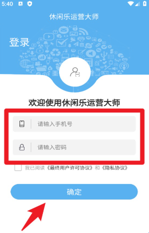 1、打开休闲乐运营大师App,输入手机号与密码完成登录,即可进入管理系统主页。