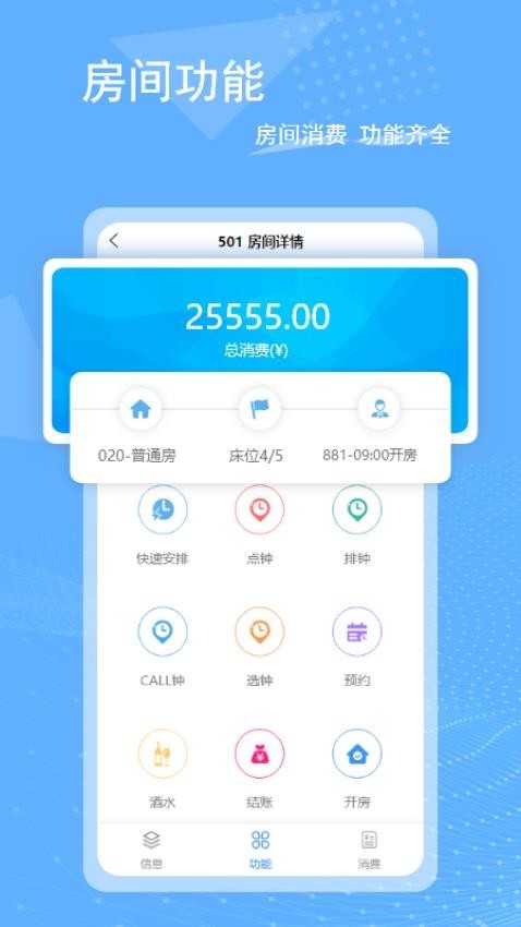 3、房间功能:为用户提供了便利的房间功能,可以在线进行房间消费的管理。
