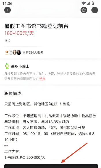 4、点击感兴趣的招聘信息,进入详情页面查看完整的职位描述、薪资待遇、工作时间等重要信息。确认无误后,点击【在线报名】按钮,提交申请,等待雇主联系。