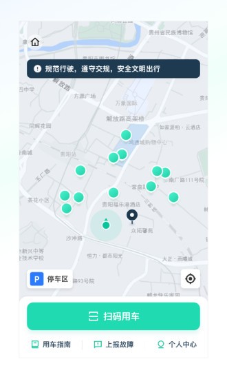 2、进入后就可以看到附近的共享车辆的位置了,如果就在身边可以直接通过扫描解锁车辆的使用权。