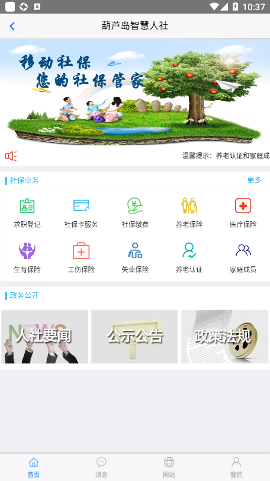 2、来到软件首页,我们可以看见社保业务、政府公开,其中就覆盖了医疗保险费、工伤保险、失业保险、政策法规、人社要闻等;