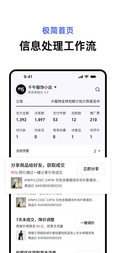 千牛极速版手机版可以帮助更多商家来对自己的线上店铺进行一站式管理,能够实时监测自己的店铺,在有异常情况时能够及时提醒商家查看自己的店铺状况,及时调整运营方案和策略,帮助商家高效运营自己的店铺;同时能够获取更多不同的管理工具来管理商品、订单、违规告警等,轻松管理自己的门店!