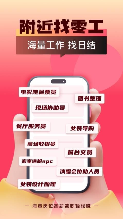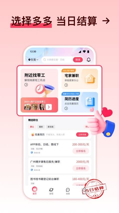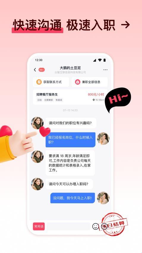 1、工资日结:兼职岗位支持日结、周结和月结等,能够提供收益保障以便用户安心兼职;