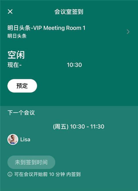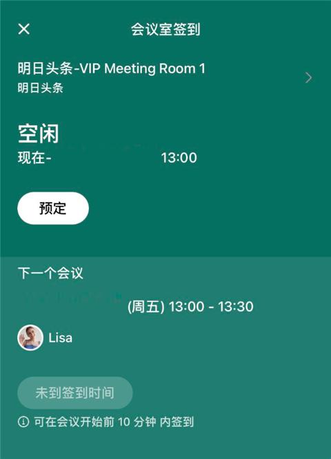 3、如果该会议室由于禁用、预定时间限制、预定范围限制等原因,在当前时间无法预定,签到页面将显示为灰色,成员可点击查看会议室空闲情况,查找空闲时段进行预定,或选择预定其他会议室。