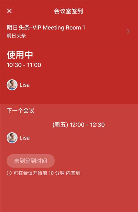 2、如果该会议室正被使用,签到页面将显示为红色,成员可点击查看会议室空闲情况,查找此会议室的空闲时段,并双击创建新的日程,进行预定。