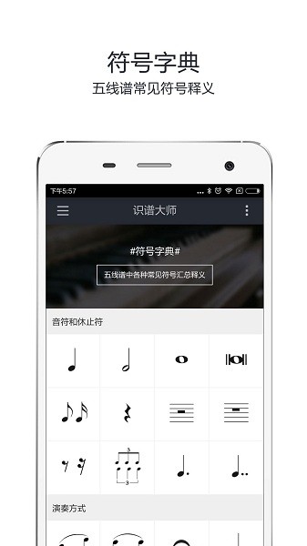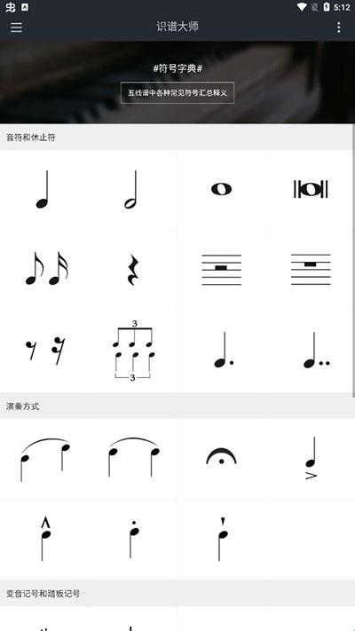 3、第二个符号字典功能板块,是对五线谱常见符号的释义;