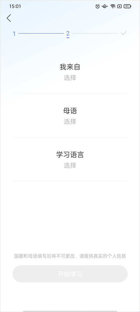 2、选择你的姓名、名称,设置你的地区、母语以及学习的语言;
