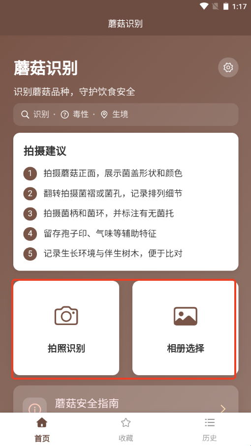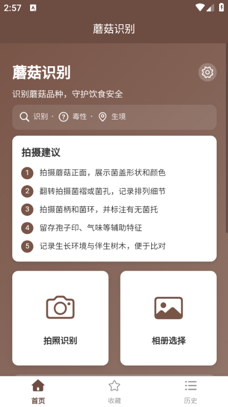 识菇鉴菌软件分享给大家,这是一款非常不错的蘑菇识别软件,大家可以直接拍照识别也能上传蘑菇照片,帮助大家快速了解各种蘑菇的特点,同时提供毒性鉴别和营养价值分析,让大家安全采摘蘑菇。