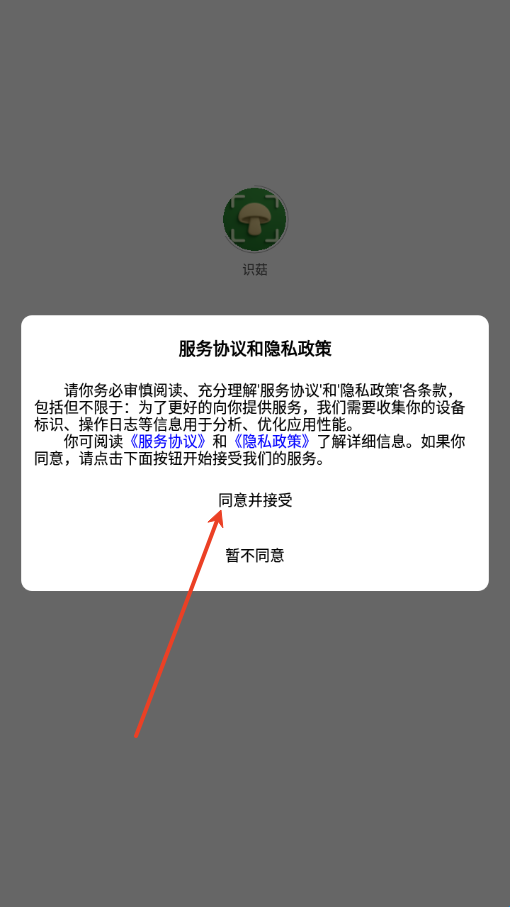 1、在本站下载好识菇鉴菌app,点击同意并接受隐私政策,