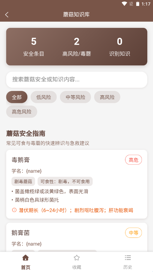 2、专业的毒性鉴别:识菇APP提供各类蘑菇的毒性信息,让用户在采摘或食用蘑菇前能够科学判断,确保自身安全。