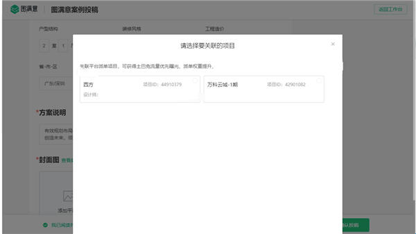 2、投稿界面页面方案信息有关联项目点击。