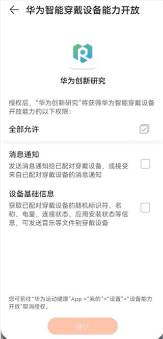 4、点击“授权提示”后,跳转至“华为智能穿戴设备能力开放”界面,根据需求进行选择并点击“确认”。
