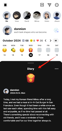 1、支持每日日记,可用表情签名表达当天感受,帮助用户记录情绪与生活点滴。