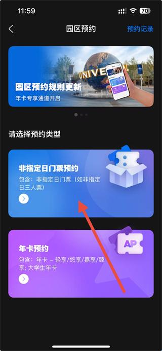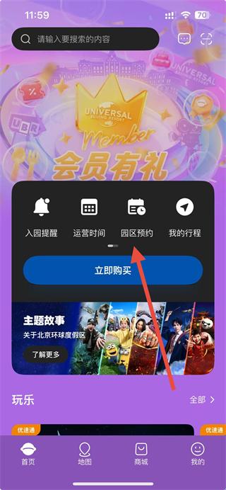 1、打开北京环球度假区APP,在首页点击园区预约选项。