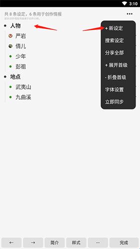2、点击人物,点击右上角的“更多”按钮,然后点击“+新设定”选项即可。
