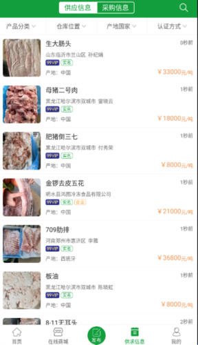 1、在首页点击供应信息,可以查看商家提供的各种肉类的价格、数量等。