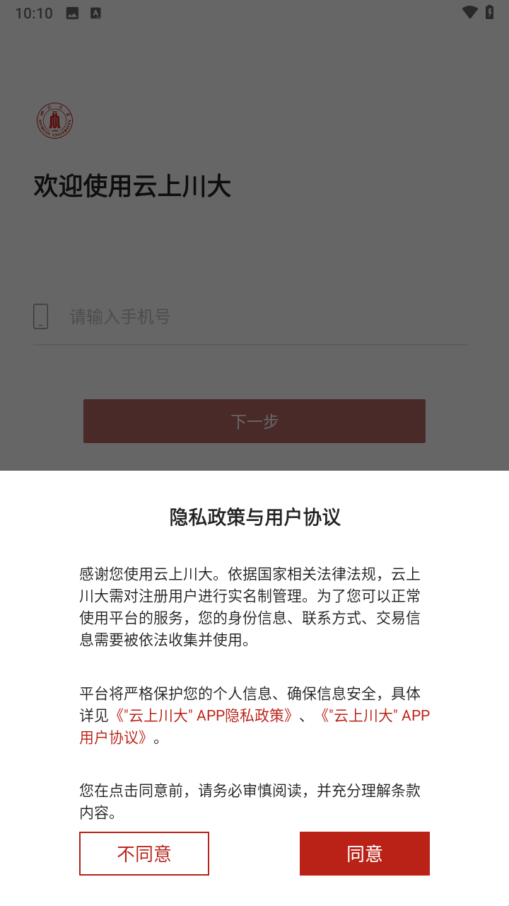 2、第一次使用,需要自定义浏览云上川大的用户协议。