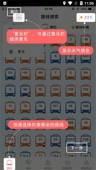 2、“路线”界面可为大家展示天气及巴士路线信息;