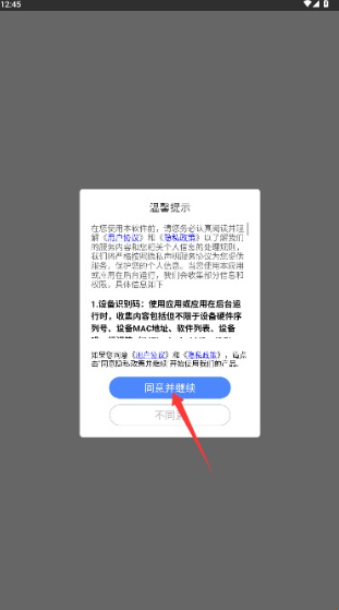 1、打开应用后仔细阅读用户协议和隐私政策,确认后点击同意并继续按钮进入。