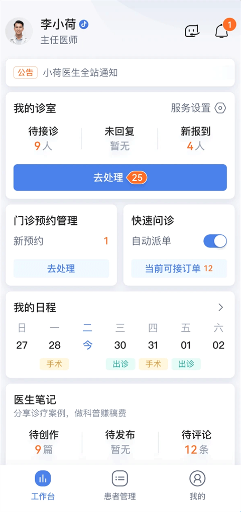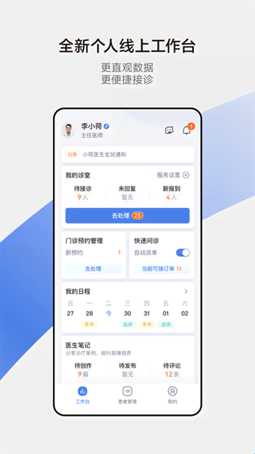 1、全新个人线上工作台:更直观数据,更便捷接诊。