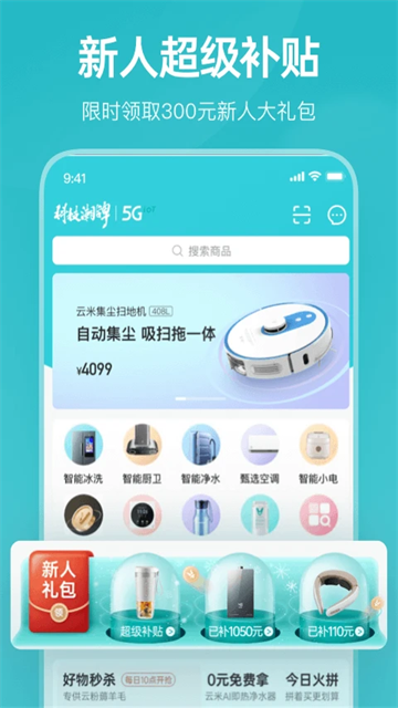 1、新人活动:新人福利加码,注册即可享受新人超级补贴,限时领取300元新人大礼包,云米自营家电随心购。