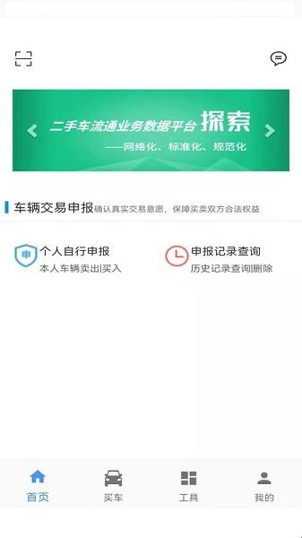 1、打开二手车流通app,首页可以进行车辆买卖申报;