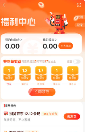 2、在“福利中心”中每日签到可领加油金,连续签到天数越多,奖励越丰厚。